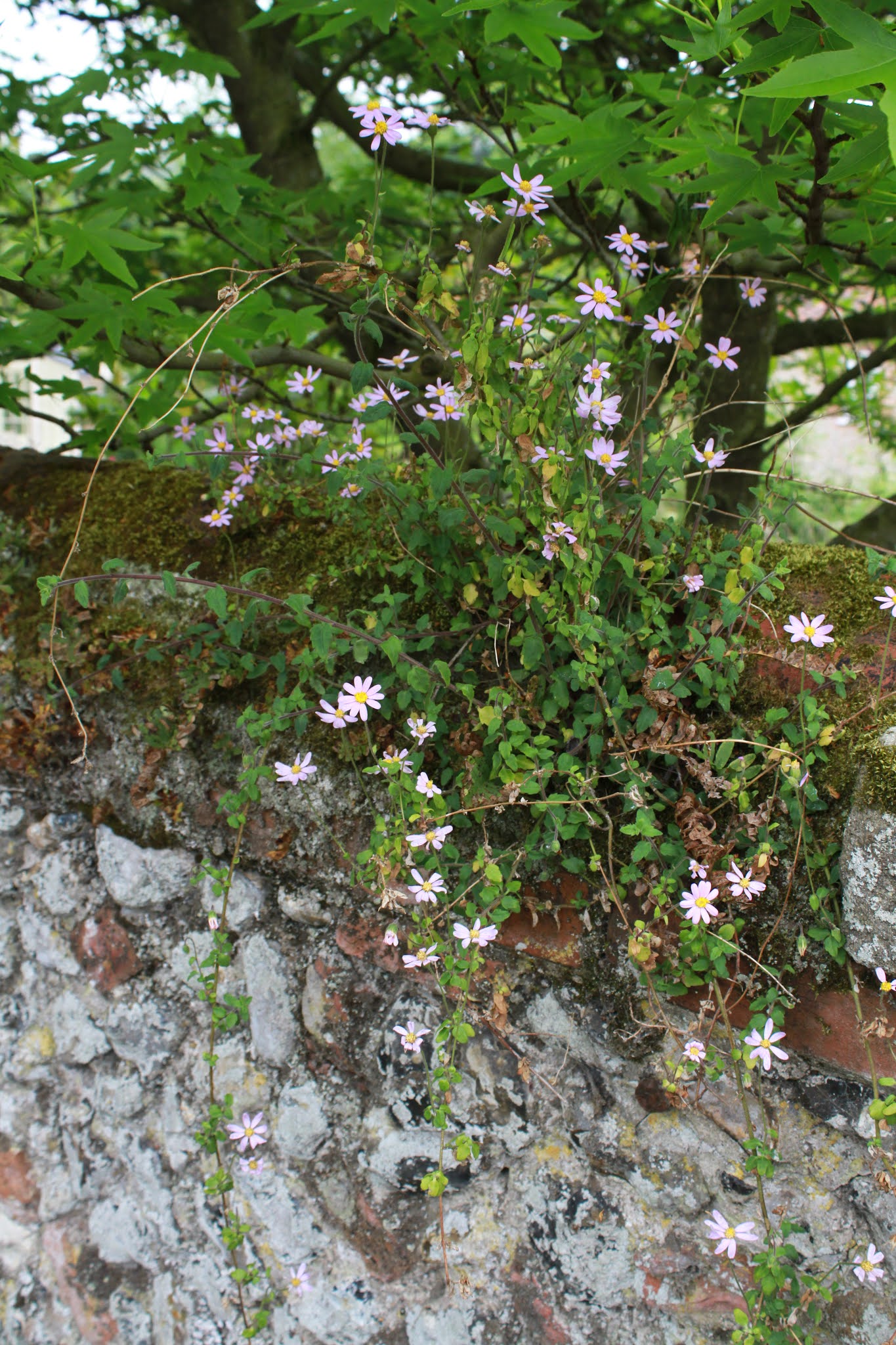 | Linking in from the last blog post, as this is a plant on a wall, is this Felicia petiolata. One of the benefits of recording non-native plants in urban environments is that it gives us a chance to monitor the progress of these species. Many will be pretty innocuous and cause no problems for the environment around us, but every invasive alien started somewhere and we can acquire a lot more accurate data on the rate of spread of a species (or otherwise) if we record it right from the start. Felicia petiolata (which appears not yet to to have earned itself an English name!) is a relatively recent addition to the suite of plants available to gardeners through the horticultural trade. I found this plant where it had self-seeded into a lovely old Norfolk wall in Stiffkey nearly five years ago and it will be interesting to return at some point and see if it is still thriving. This species is from South Africa and is sold as a half-hardy plant for hanging baskets, but it does seem to be starting to get through our winters OK and it is a perennial, so could become the next Mexican Fleabane! |